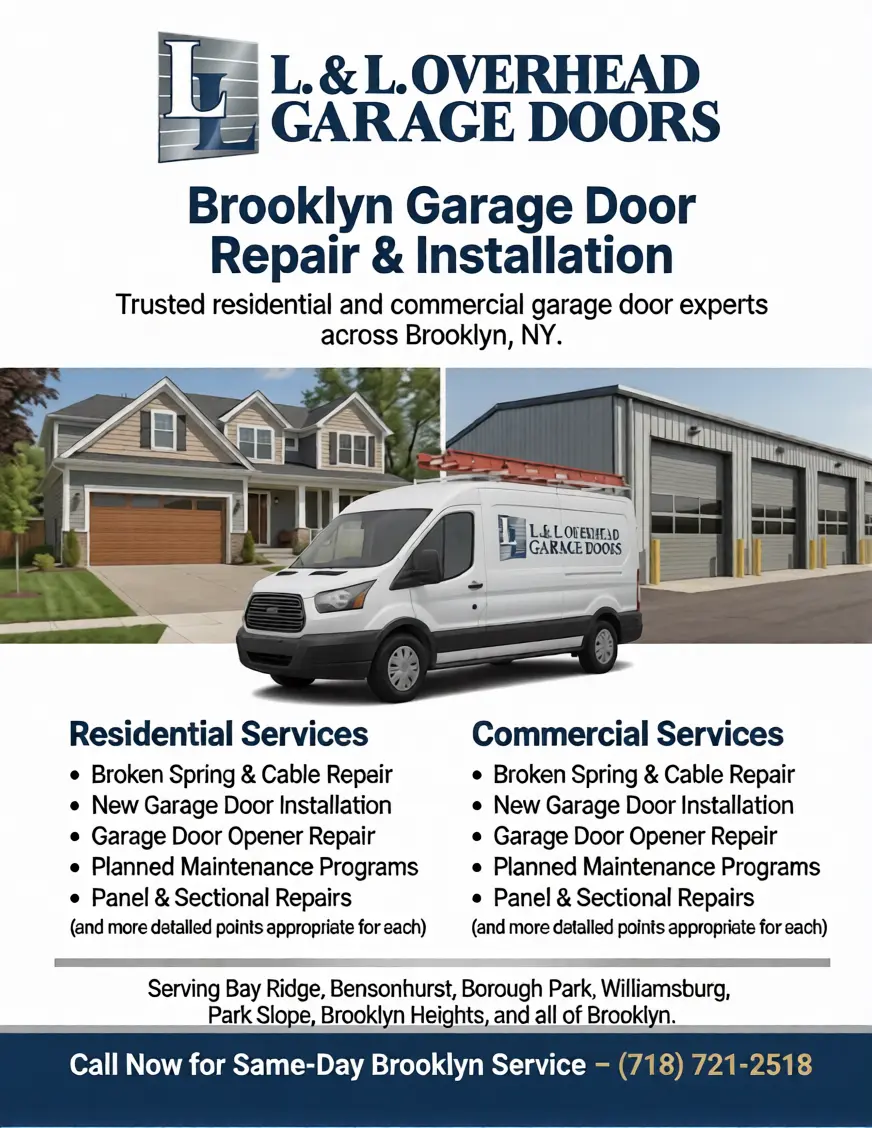 Yes. L&L Overhead Garage Doors provides garage door repair, installation, opener service, maintenance, and emergency service throughout Brooklyn, NY. We work with both residential and commercial garage doors and focus on reliable service, quality parts, and straightforward pricing.