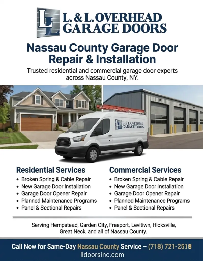 Yes. L&L Overhead Garage Doors provides garage door repair, installation, opener service, maintenance, and emergency service throughout Nassau County, NY. We work with both residential and commercial garage doors and focus on reliable service, quality parts, and straightforward pricing.